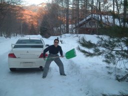 | スキーから戻ってみるとビックリ 道の除雪された雪が駐車スペースを 潰していました ここで、除雪機の大活躍です!! 作業者:わかば ひろみちゃんがわかばカーに乗って いますが見えますでしょうか? |