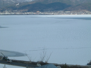 | 諏訪湖の御神渡(おみわたり)です 諏訪湖SAから撮りましたので見難いですね (^^; 中央やや上とチョッと下にある様です 御神渡りができる原理はNHKのページにありました |