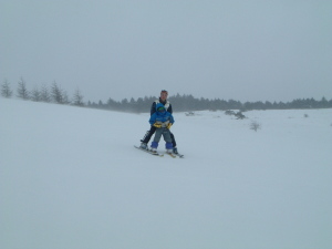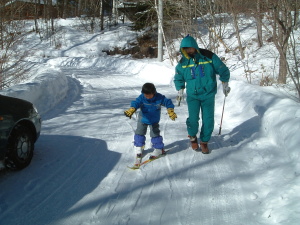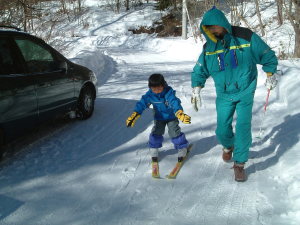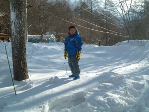 | 8日はログハウス前の道でスキーの特訓から 始まりました 積雪1cm位ですのですので「スキーは滑れる」し 「歩行もできる」のがとてもよい練習ゲレンデに なっていました |